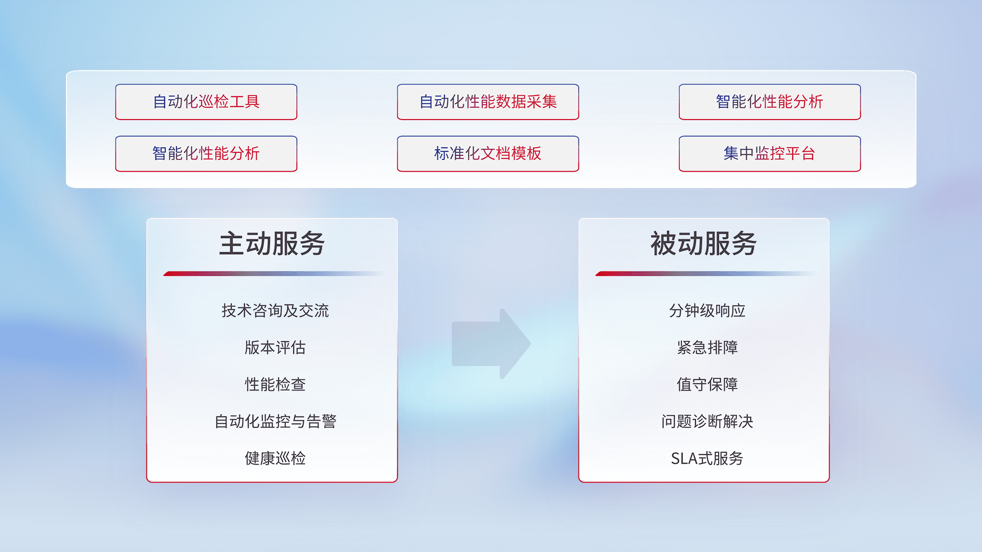 智能化工具和标准化文档,,,,保障服务质量,,,,提供主动服务(包含技术咨询、、、版本评估、、性能检查、、、自动化监控与告警、、健康巡检)和被动服务包含(分钟级响应、、紧急排障、、、值守保障、、、、问题诊断解决、、SLA服务)。。。